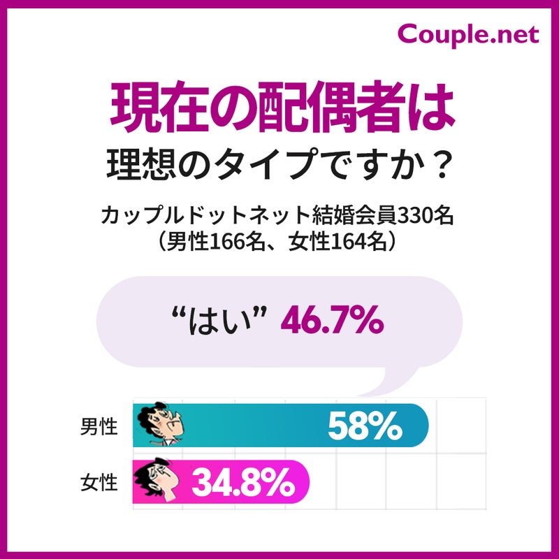 その結果、現在の配偶者が理想のタイプと一致すると答えた人は、全体の46.7%でした。