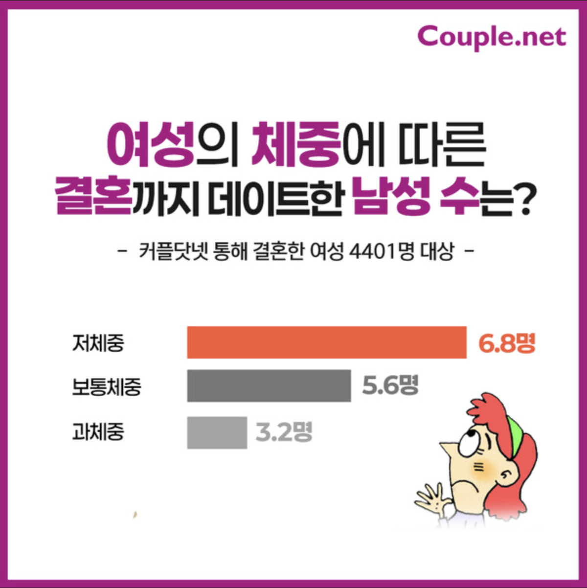 글로벌 매칭 플랫폼 커플닷넷은 자사를 통해 결혼한 여성 4401명이 결혼 전까지 데이트한 남성을 분석했다. 이를 위해 4401명의 체중 평균을 내어 과체중, 보통 체중, 저체중, 3개 그룹으로 분류했다.