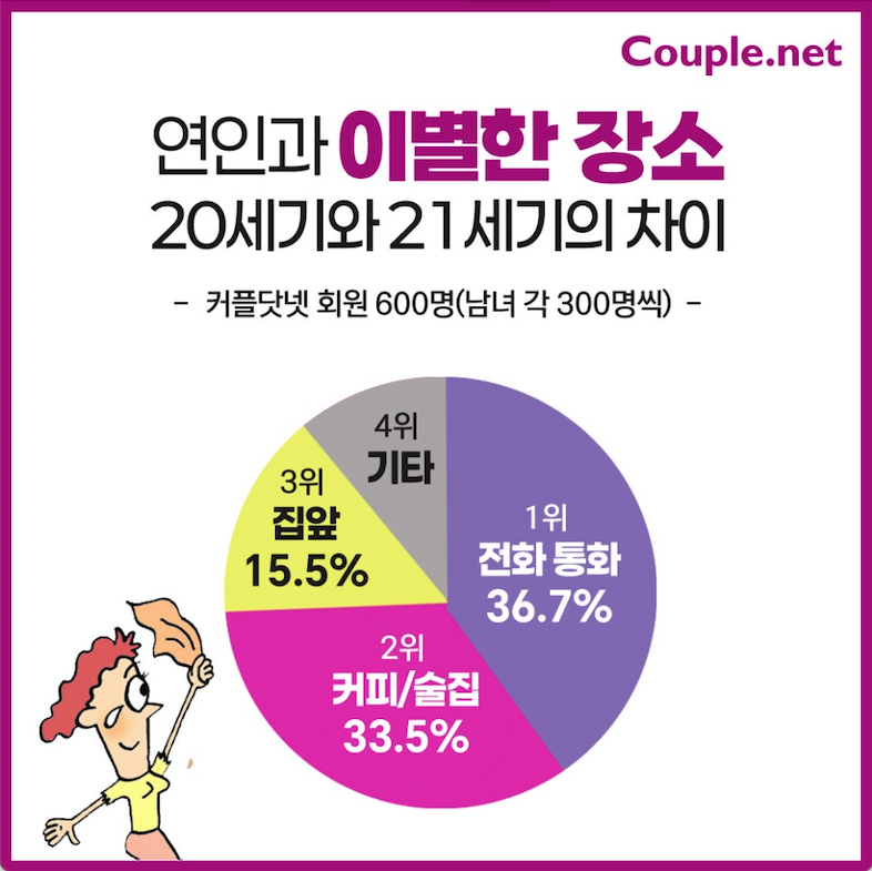 글로벌 매칭 플랫폼 커플닷넷은 사이트에 가입한 회원들 중에 연인과 헤어진 경험이 있는 남녀 각 300명, 총 600명에게 이별한 장소를 설문조사했다. 커플닷넷은 1995년에도 동일한 조사를 진행한 적이 있어서 두 조사 결과를 바탕으로 20세기와 21세기에 연인과 헤어지는 장소를 비교했다.