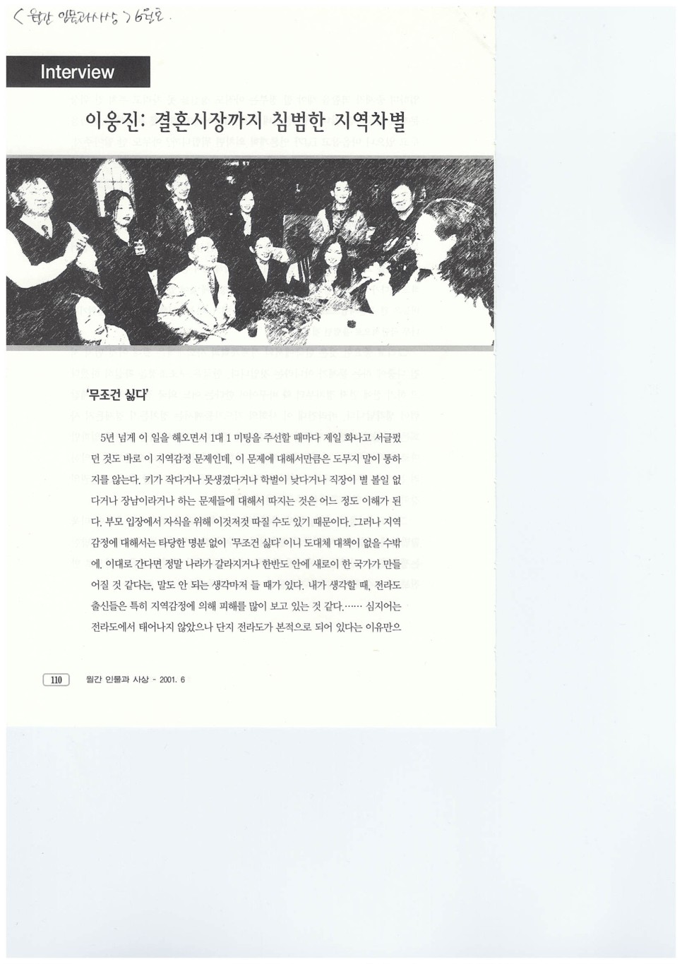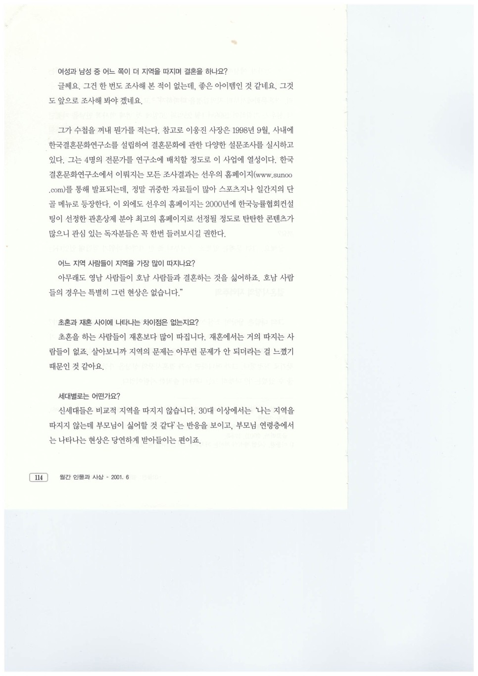 어, 기자가 예상하지 못했던 답이다. "가지고 있어도 하등 도움이 안 되는 것, 아니 오히려 행복해지는데 방해가 되는 것이 바로 지역감정"이니 "제발 우리, 결혼문화에서부터 지역감정을 타파하자"고 주장했던 그가 아닌가! 더군다나 결혼정보회사 선우가 기획하여 1998년 1월 25일과 26일에 첫번째 역사적 만남을 가졌던 영호남 선남선녀들의 설날 귀향길 카풀 미팅도 "우리 사회에 만연한 지역주의에 대한 조소였다"고 밝힌 그가 아닌가? 혼자 힘으로, 그리고 이벤트 행사로 4) 해결할 수 없는 근본적인 문제가 있었다며, 행사의 실패를 승인했던 것처럼, 그는 결혼정보회사 선우의 행복추구권 차원에서 결혼시장의 지역차별 문제를 이해하기로 한 것인가?