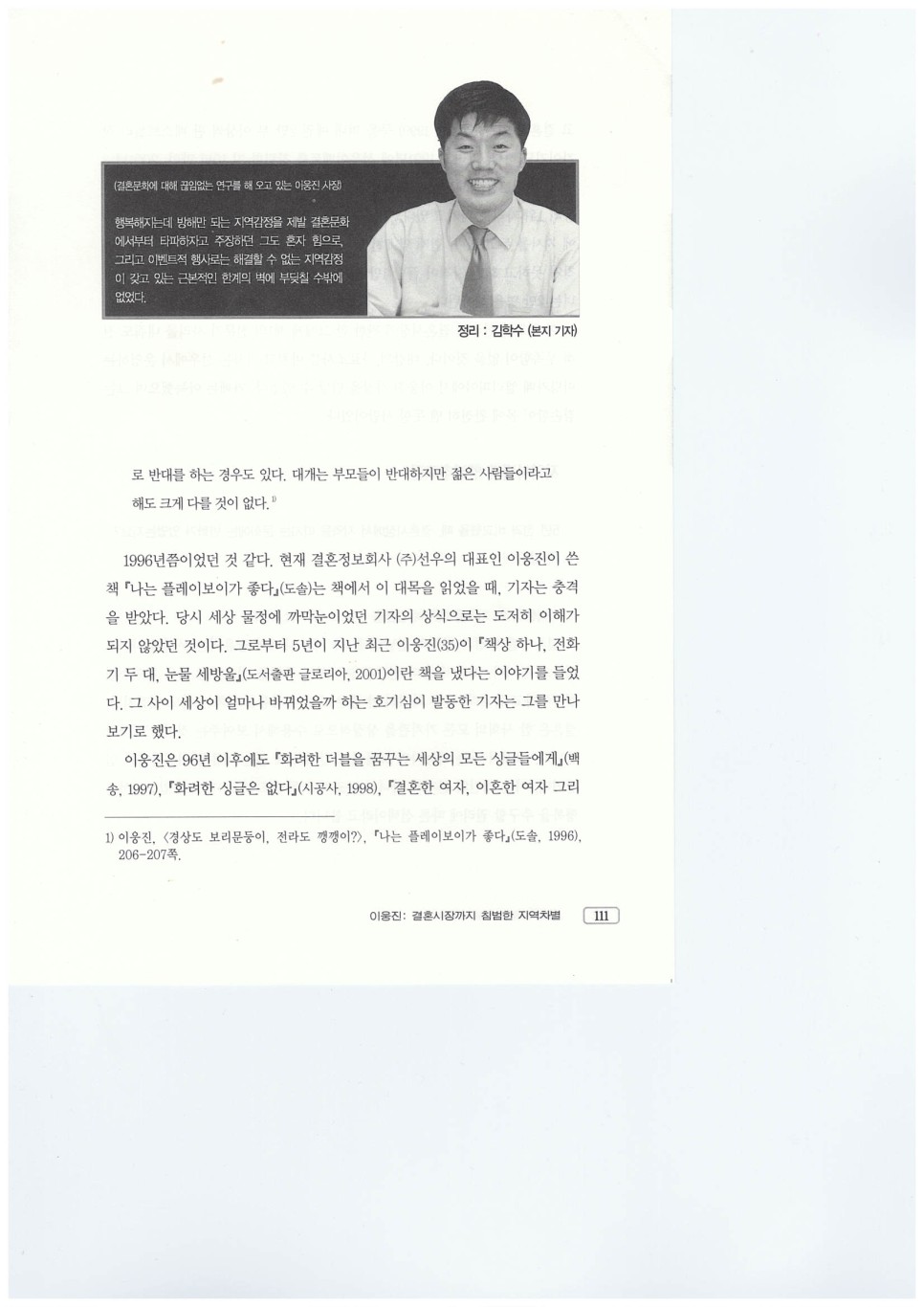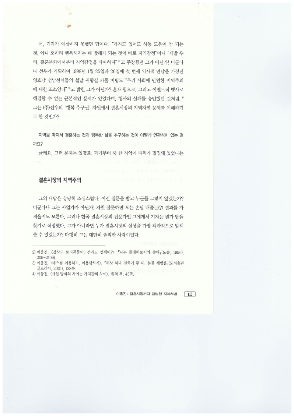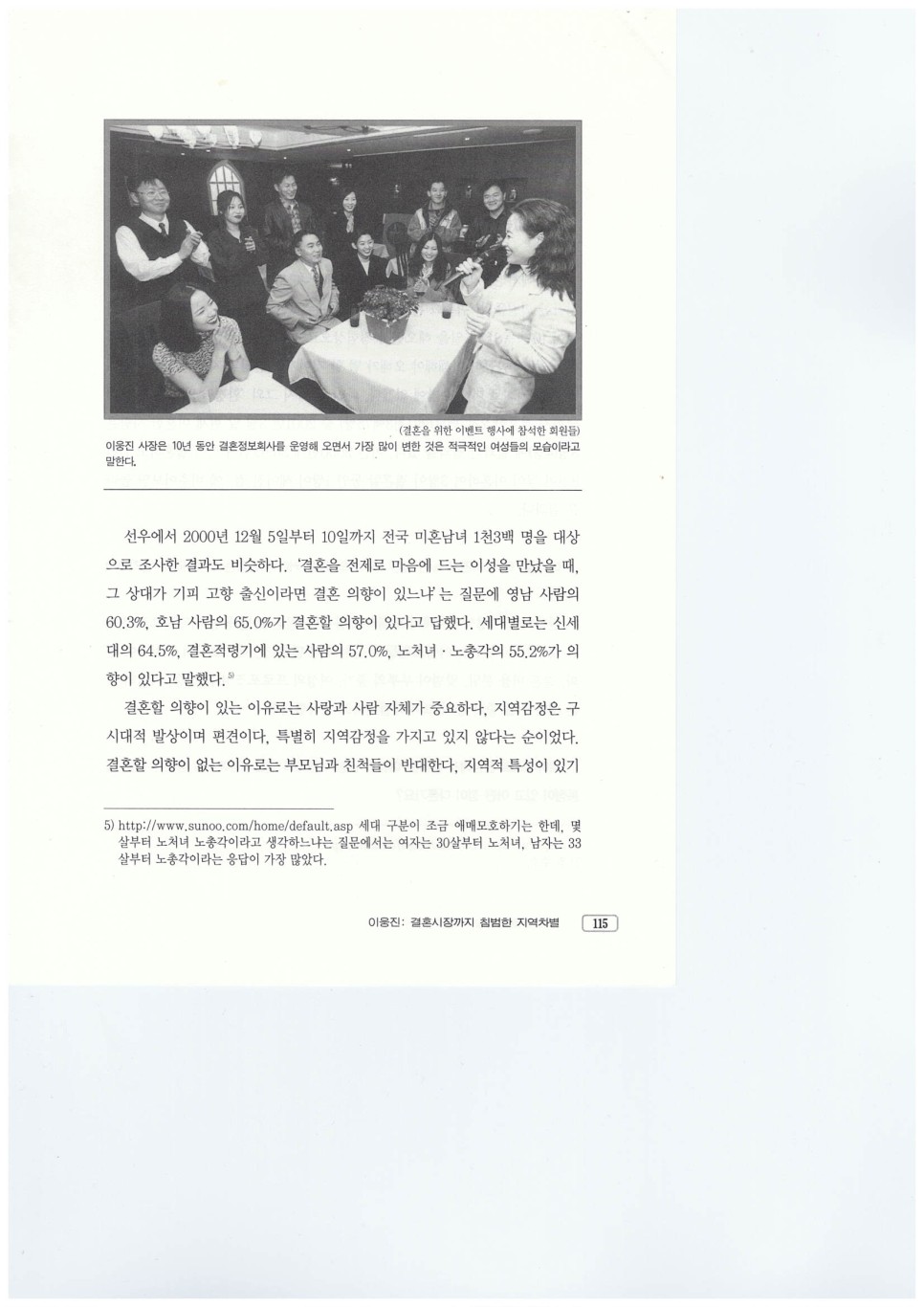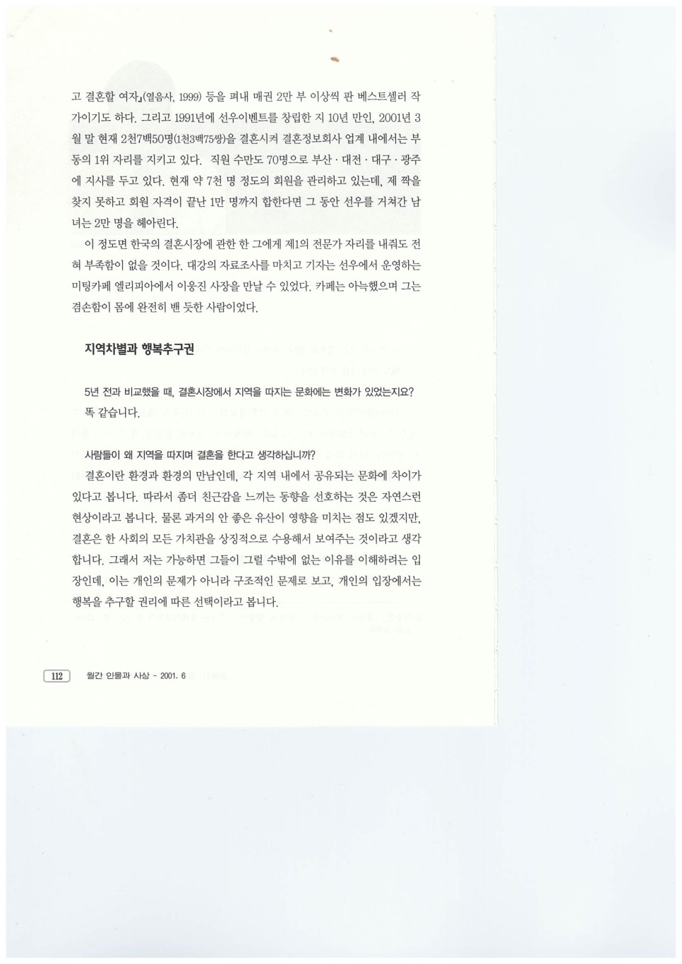 결혼시장의 지역주의그의 대답은 상당히 조심스럽다. 이런 질문을 받고 누군들 그렇지 않겠는가? 더군다나 그는 사업가가 아닌가! 자칫 잘못하면 오는 손님 내쫒는(?) 결과를 가져올지도 모른다. 그러나 한국 결혼시장의 전문가인 그에게서 기자는 뭔가 답을 찾기로 작정했다. 그가 아니라면 누가 결혼시장의 실상을 가장 객관적으로 말해 줄 수 있겠는가? 다행히 그는 대단히 솔직한 사람이었다.