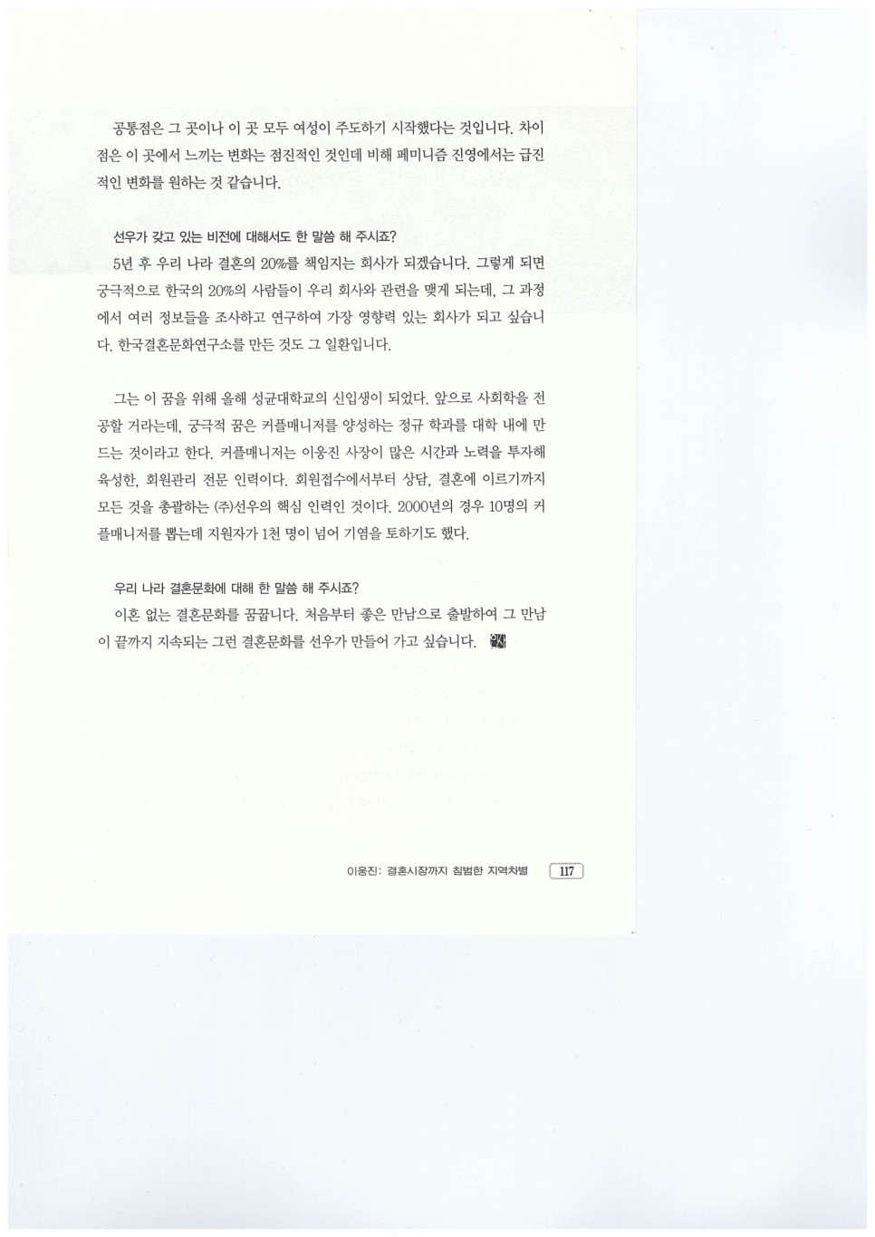 그가 수첩을 꺼내 뭔가를 적는다. 참고로 이웅진 사장은 1998년 9월, 사내에 한국결혼문화연구소를 설립하여 결혼문화에 관한 다양한 설문조사를 실시하고 있다. 그는 4명의 전문가를 연구소에 배치할 정도로 이 사업에 열성이다. 한국 결혼문화연구소에서 이뤄지는 모든 조사결과는 결혼정보회사 선우의 홈페이지(