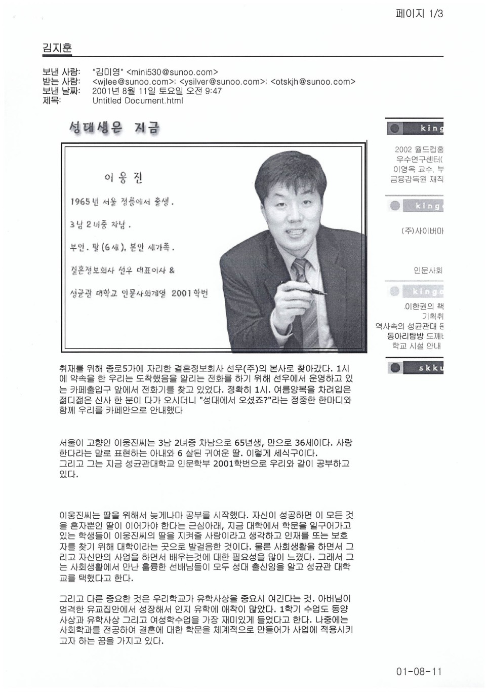 이웅진 결혼정보회사 선우 사장취재를 위해 종로5가에 자리한 결혼정보회사 선우의 본사로 찾아갔다. 취재를 위해 종로5가에 자리한 결혼정보회사 선우의 본사로 찾아갔다. 1시에 약속을 한 우리는 도착했음을 알리는 전화를 하기 위해 결혼정보회사 선우에서 운영하고 있는 카페출입구 앞에서 전화기를 찾고 있었다. 정확히 1시. 여름양복을 차려입은 젊디젊은 신사 한 분이 다가 오시더니 "성대에서 오셨죠?"라는 정중한 한마디와 함께 우리를 카페 안으로 안내했다