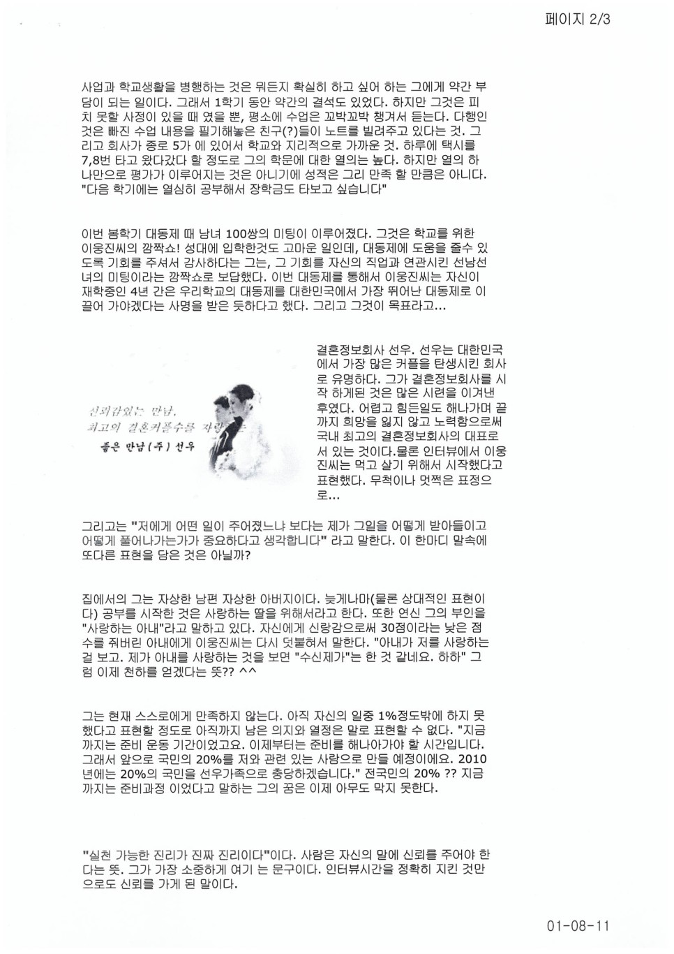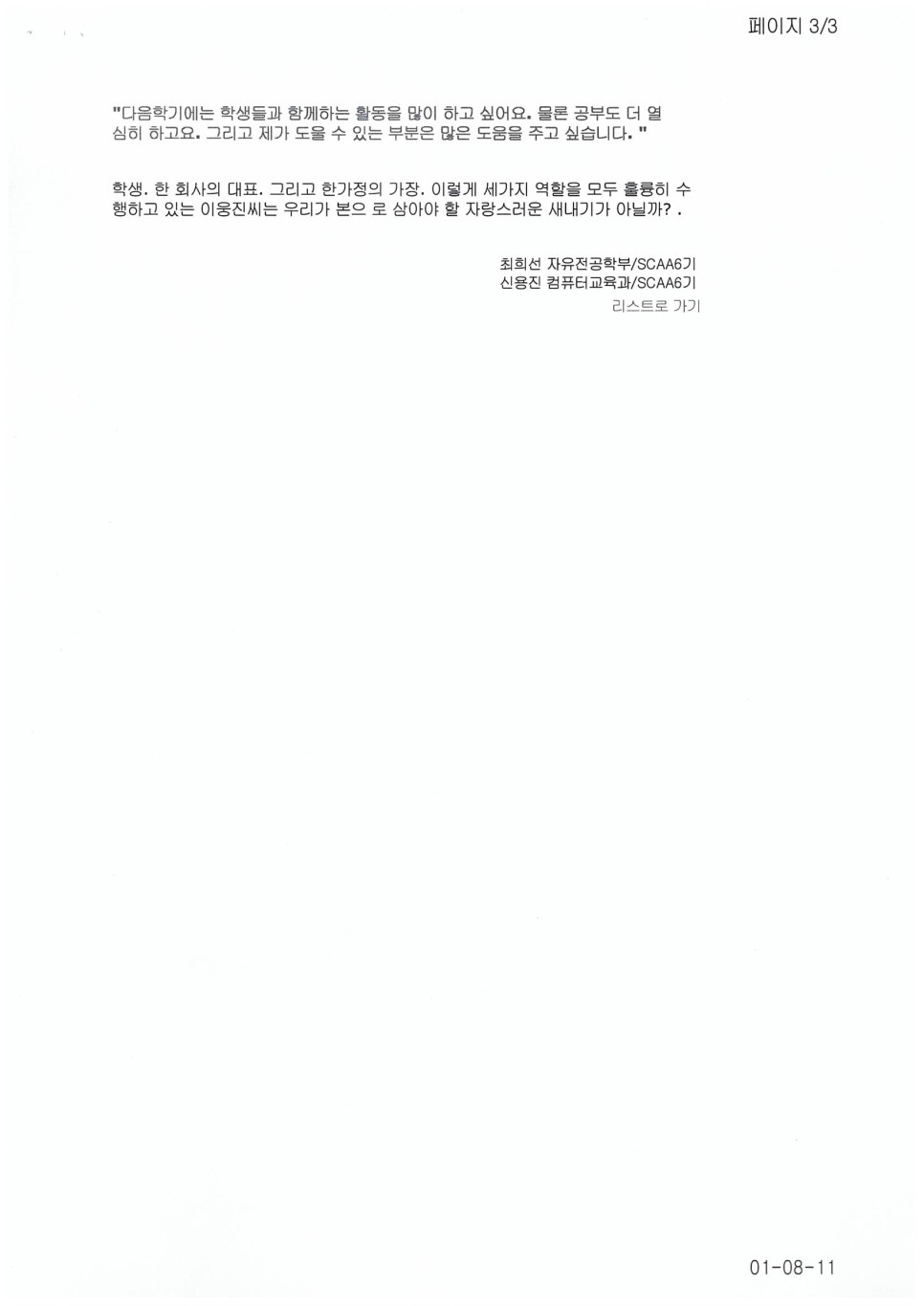 학생. 한 회사의 대표. 그리고 한가정의 가장. 이렇게 세 가지 역할을 모두 훌륭히 수행하고 있는 이웅진씨는 우리가 본으로 삼아야 할 자랑스러운 새내기가 아닐까?.