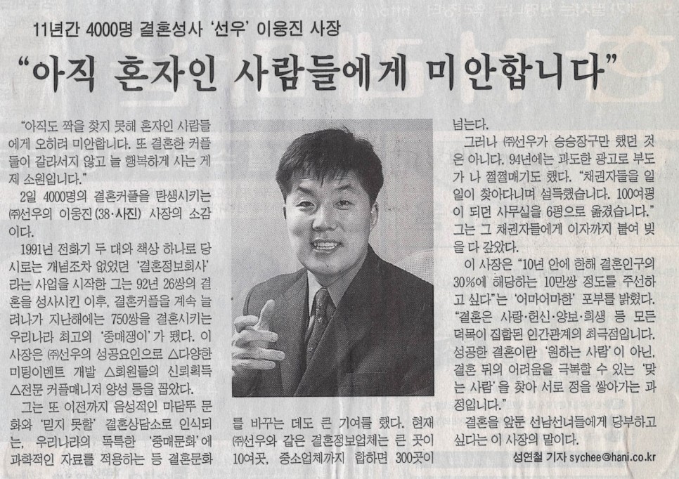 11년간 4000명 결혼성사 '결혼정보회사 선우' 이웅진 사장2일 4000명의 결혼커플을 탄생시키는 결혼정보회사 선우 이웅진 (38·사진) 사장의 소감이다. 1991년 전화기 두 대와 책상 하나로 당 시로는 개념조차 없었던 '결혼정보회사'라는 사업을 시작한 그는 92년 26쌍의 결혼을 성사시킨 이후, 결혼커플을 계속 늘려나가 지난해에는 750쌍을 결혼시키는 우리나라 최고의 '중매쟁이'가 됐다. 이 사장은 결혼정보회사 선우의 성공요인으로 △다양한 미팅이벤트 개발 △회원들의 신뢰 획득 △전문 커플매니저 양성등을 꼽았다.