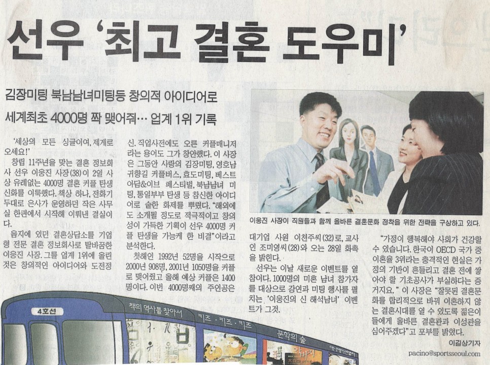 첫 해인 1992년 52명을 시작으로 2000년 908명, 2001년 1050명을 커플로 맺어줬고 올해 예상 커플은 1400명이다. 이번 4000명째의 주인공은 대기업 사원 이천주씨(32)로, 교사인 조미영씨(28)와 오는 28일 화촉을 밝힌다.
