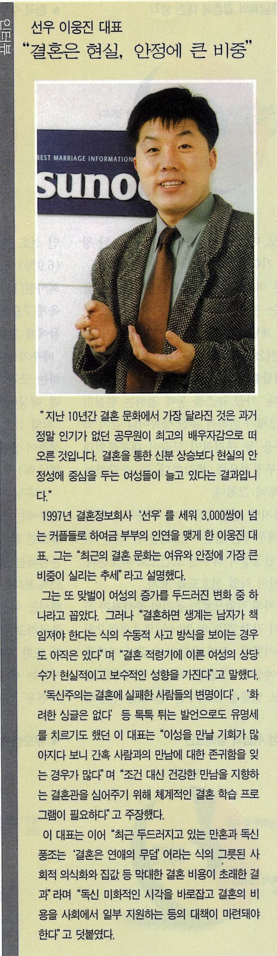 1997년 결혼정보회사 '선우'를 세워 3,000쌍이 넘는 커플들로 하여금 부부의 인연을 맺게 한 이웅진 대표. 그는 '최근의 결혼 문화는 여유와 안정에 가장 큰 비중이 실리는 추세'라고 설명했다.