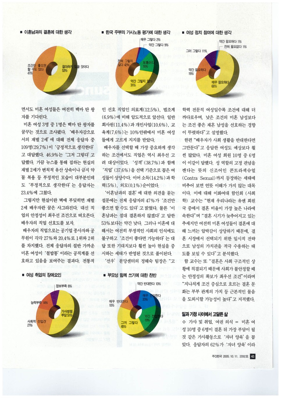 한편 '배우자가 사회 생활을 반대한다면 그만둔다'고 응답한 여성도 예상보다 훨씬 많았다. 미혼 여성 회원 10명 중 6명이 이같이 답했다. 성 역할의 고정 관념을 깬다는 뜻의 신조어인 콘트라섹슈얼(Contra Sexual)까지 등장하는 세태에 비추어 보면 언뜻 이해가 가지 않는 대목이다. 이에 대해 이화여대 함인희 (사회학) 교수는 '현재 우리나라는 유엔 회원국 중에서 결혼 비율이 가장 높은 나라에 속한다'며 '결혼 시기가 늦추어지고 있는 추세지만 여전히 미혼 여성들이 결혼에 대해 느끼는 압박감이 상당하기 때문에, 결혼 시장에서 선택되기 위한 일시적 전략으로 남성의 가치관을 적극 수용하는 태도를 보일 수 있다'고 분석했다.