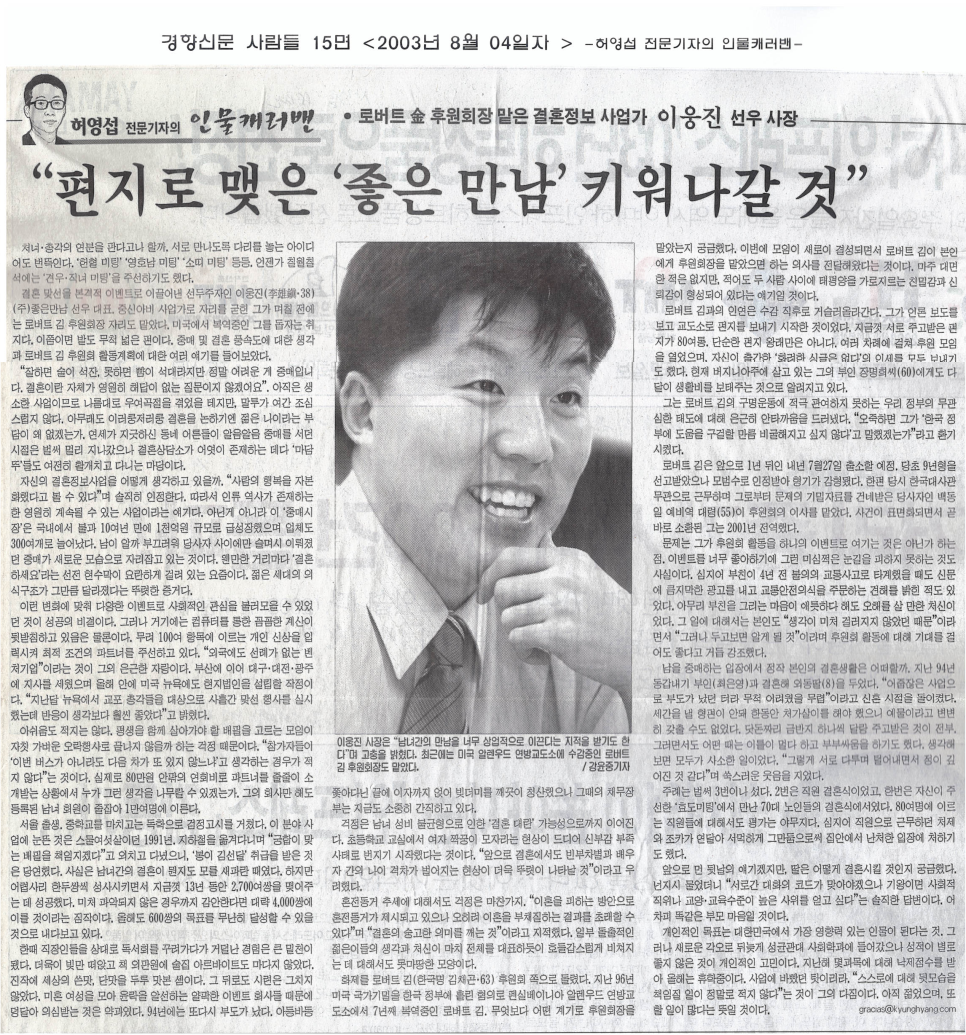 로버트 金 후원회장 맡은 결혼정보 사업가 이웅진 결혼정보회사 선우 사장처녀총각의 연분을 판다고나 할까. 서로 만나도록 다리를 놓는 아이디어도 번뜩인다. '헌혈 미팅' '영호남 미팅' '소띠 미팅' 등등. 언젠가 칠월칠석에는 '견우직녀 미팅'을 주선하기도 했다. 결혼 맞선을 본격적 이벤트로 이끌어낸 선두주자인 이웅진(李雄鎭.38) 결혼정보회사 (주)선우 대표, 중신아비 사업가로 자리를 굳힌 그가 며칠 전에는 로버트 김 후원회장 자리도 맡았다. 미국에서 복역중인 그를 돕자는 취지다. 이쯤이면 발도 무척 넓은 편이다. 중매 및 결혼 풍속도에 대한 생각과 로버트 김 후원회 활동계획에 대한 여러 얘기를 들어보았다.