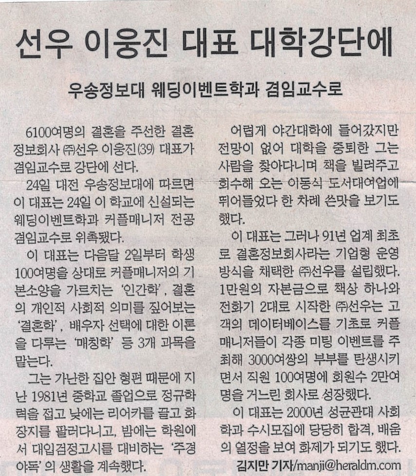 우송정보대 웨딩이벤트학과 겸임교수로..24일 대전 우송정보대에 따르면 이 대표는 24일 이 학교에 신설되는 웨딩이벤트학과 커플매니저 전공 겸임교수로 위촉됐다. 이 대표는 다음달 2일부터 학생 100여명을 상대로 커플매니저의 기본소양을 가르치는 '인간학', 결혼의 개인적 사회적 의미를 짚어보는 '결혼학', 배우자 선택에 대한 이론을 다루는 '매칭학' 등 3개 과목을 맡는다.