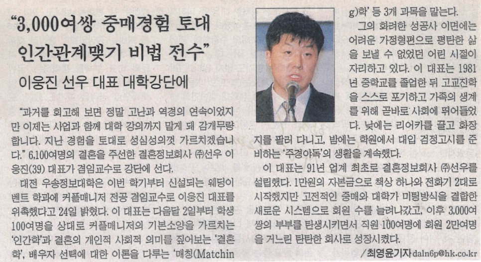 이웅진 결혼정보회사 선우 대표 대학강단에"과거를 회고해 보면 정말 고난과 역경의 연속이었지만 이제는 사업과 함께 대학 강의까지 맡게 돼 감개무량 합니다." 지난 경험을 토대로 성심성의껏 가르치겠습니다.” 6,100여명의 결혼을 주선한 결혼정보회사 선우 이웅진(39) 대표가 겸임교수로 강단에 선다.