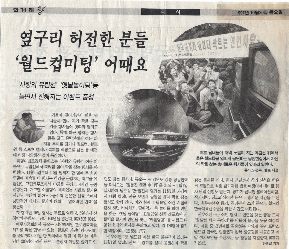 결혼정보회사 선우 (Couple.net)도 월드컵 예선 한국-일본전이 열리는 11월1일 멀티비전으로 경기를 보며 응원하며 짝을 찾는 행사를 연다. 행사 전날까지 참가 신청을 받은 뒤 추첨으로 최종 참가자를 뽑을 예정이며 예비로 행사당일 신청도 받는다. 경기가 끝나면 로테이션미팅, 장기자랑, 레크리에이션 등으로 흥겨운 시간을 보낸다. 최우수 선수 뽑기, 격려편지 쓰기 등으로 월드컵 한국대표선수들을 위한 시간도 마련했다. 결혼정보회사 선우 는 이번 행사로 인연을 맺는 쌍을 모아 '월드컵 쌍쌍 동아리'를 만들어 활동을 도울 예정이다. 이들 중 첫번째로 결혼하는 쌍에게 98년 프랑스 월드컵 한국전 입장권과 왕복 항공권을 제공하고 매 달 정기모임을 주선하는 등 활동을 지원한다. (02) 747-2345.
