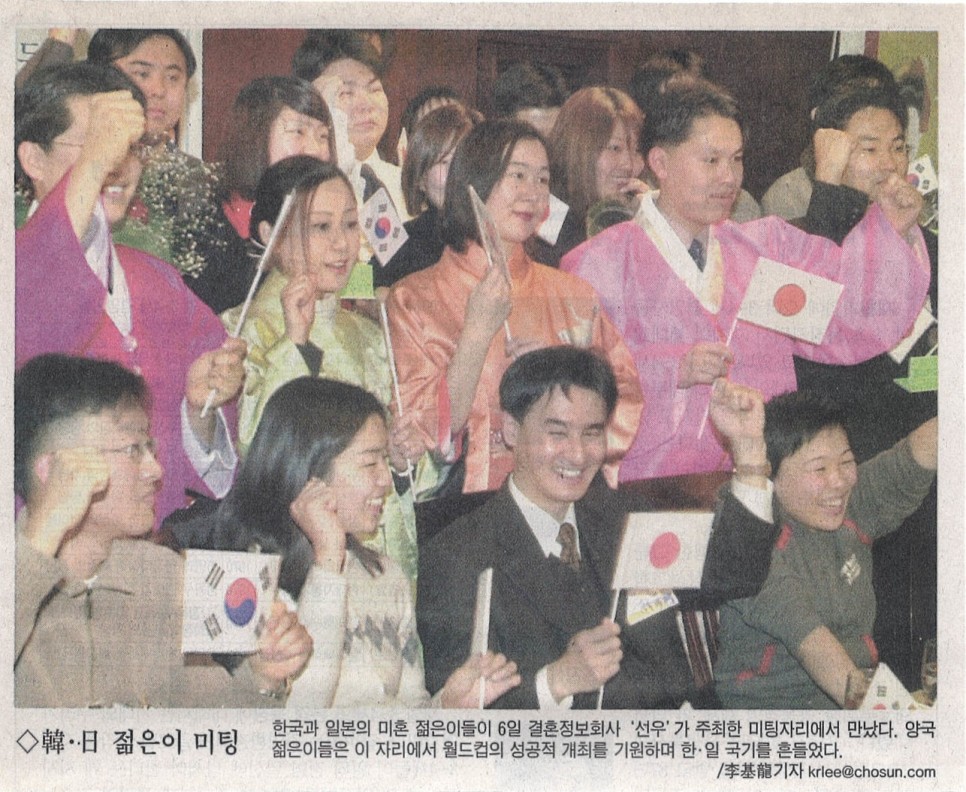 한국과 일본의 미혼 젊은이들이 6일 '결혼정보회사 선우 (Couple.net)'가 주최한 미팅자리에서 만났다. 양국 젊은이들은 이 자리에서 월드컵의 성공적 개최를 기원하며 한·일 국기를 흔들었다.