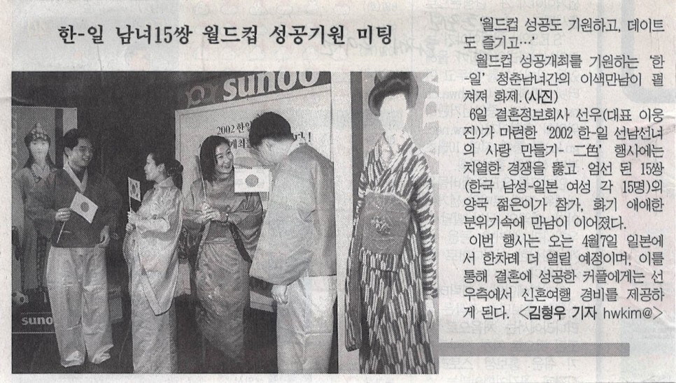 '월드컵 성공도 기원하고, 데이트도 즐기고....6일 결혼정보회사 선우 (Couple.net)(대표 이웅진)가 마련한 '2002 한일 선남선녀의 사랑 만들기' 행사에는 치열한 경쟁을 뚫고 엄선된 15쌍 (한국 남성-일본 여성 각 15명)의 양국 젊은이가 참가, 화기애애한 분위기속에 만남이 이어졌다. 이번 행사는 오는 4월7일 일본에서 한차례 더 열릴 예정이며, 이를 통해 결혼에 성공한 커플에게는 결혼정보회사 선우 (Couple.net)측에서 신혼여행 경비를 제공하게 된다.