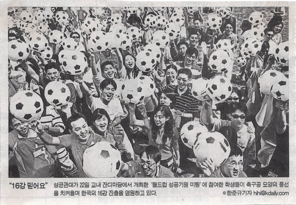 성균관대가 22일 교내 잔디마당에서 개최한 '월드컵 성공기원 미팅' 에 참여한 학생들이 축구공 모양의 풍선을 치켜들며 한국의 16강 진출을 염원하고 있다.