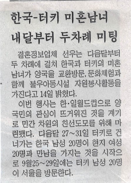 두 차례에 걸쳐 한국과 터키의 미혼남녀를 위한 이벤트...결혼정보회사 선우는 다음달부터 두 차례에 걸쳐 한국과 터키의 미혼 남녀가 양국을 교환방문, 문화체험과 함께 불우아동시설 자원봉사활동을 가진다고 14일 밝혔다. 이번 행사는 한·일월드컵으로 양 국민의 관심이 뜨거워진 것을 계기로 민간 차원의 친선도모를 위해 마련됐다. 다음달 27~31일 터키로 건너가는 한국 남성 20명이 현지 여성 20명과 만남을 가지는 것을 시작으로 9월25~29일에는 터키 남성 20명이 서울을 방문한다.