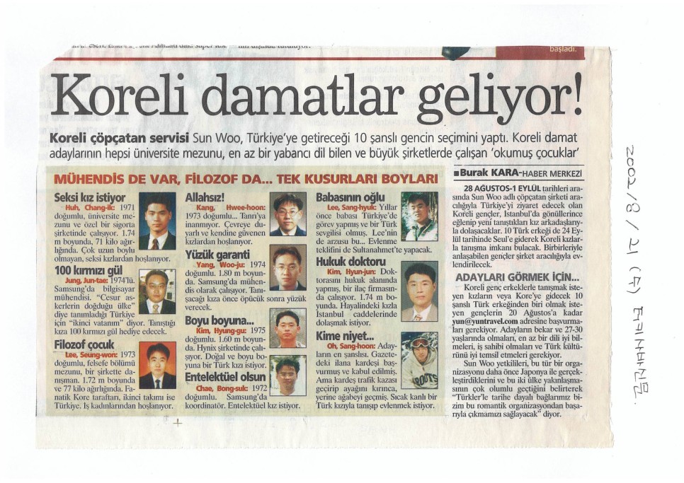 (28 AĞUSTOS-1 EYLÜL tarihleri ara- sında Sun Woo adlı çöpçatan şirketi ara- cılığıyla Türkiye'yi ziyaret edecek olan Koreli gençler, İstanbul'da gönüllerince eğlenip yeni tanıştıkları kız arkadaşlarıy- la dolaşacaklar. 10 Türk erkeği de 24 Ey- lül tarihinde Seul'e giderek Koreli kızlar- la tanışma imkanı bulacak. Birbirleriyle anlaşabilen gençler şirket aracılığıyla ev- lendirilecek.)
