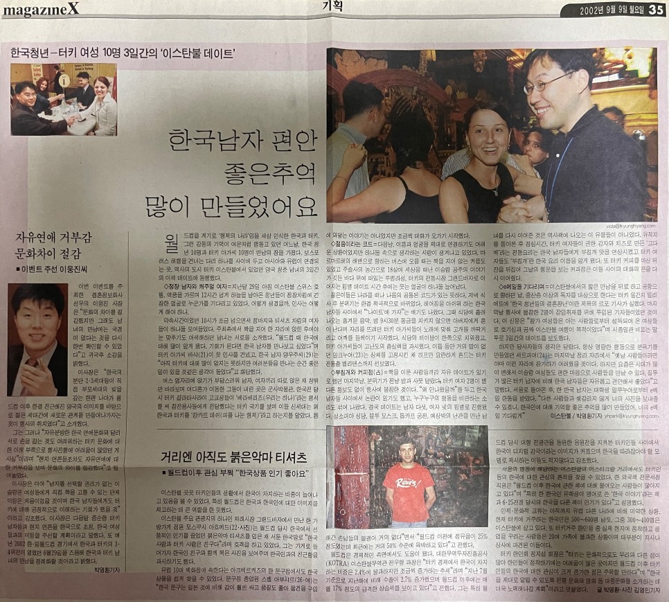 ◇ e메일을 기다리며 = 이스탄불에서의 짧은 만남을 뒤로 하고 공항으로 향하던 날. 중산층 이상의 독자를 대상으로 한다는 터키 일간지 밀리 에트에 '한국 청년들의 결혼장난'이란 제목의 르포 기사가 실렸다. 마지막날 행사에 불참한 2명이 잠입취재를 위해 투입된 기자들이었던 것이다. 이 신문은 '참가 여성들은 아는 사람들로부터 설득되어 온 여성들로 호기심과 공짜 이스탄불 여행이 목적이었다'며 시종일관 비꼬는 말투로 3일간의 데이트를 보도했다.