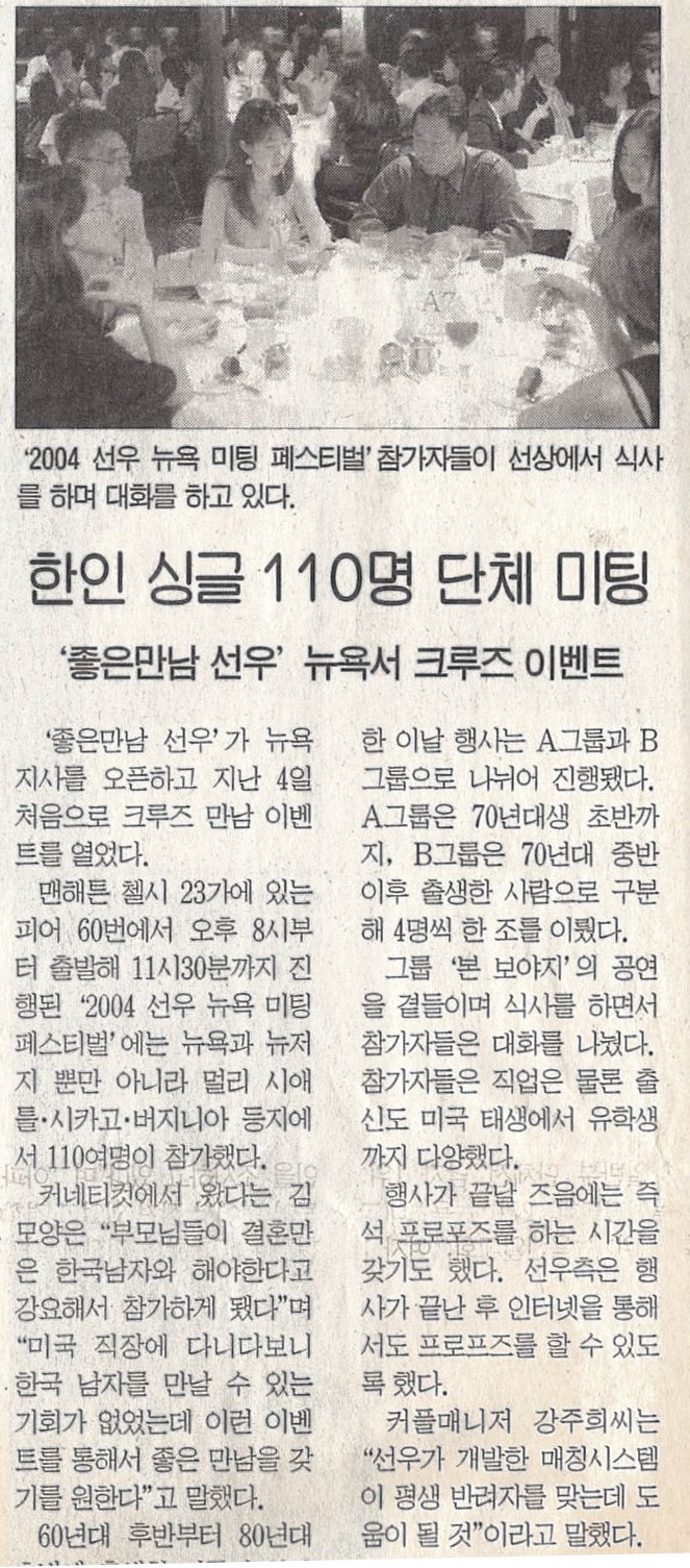 좋은만남 선우' 뉴욕서 크루즈 이벤트결혼정보회사 선우가 뉴욕 지사를 오픈하고 지난 4일 처음으로 크루즈 만남 이벤트를 열었다. 맨해튼 첼시 23가에 있는 피어 60번에서 오후 8시부터 출발해 11시30분까지 진행된 '2004 선우 뉴욕 미팅 페스티벌'에는 뉴욕과 뉴저지 뿐만 아니라 멀리 시애틀 시카고 버지니아 등지에서 110여명이 참가했다.