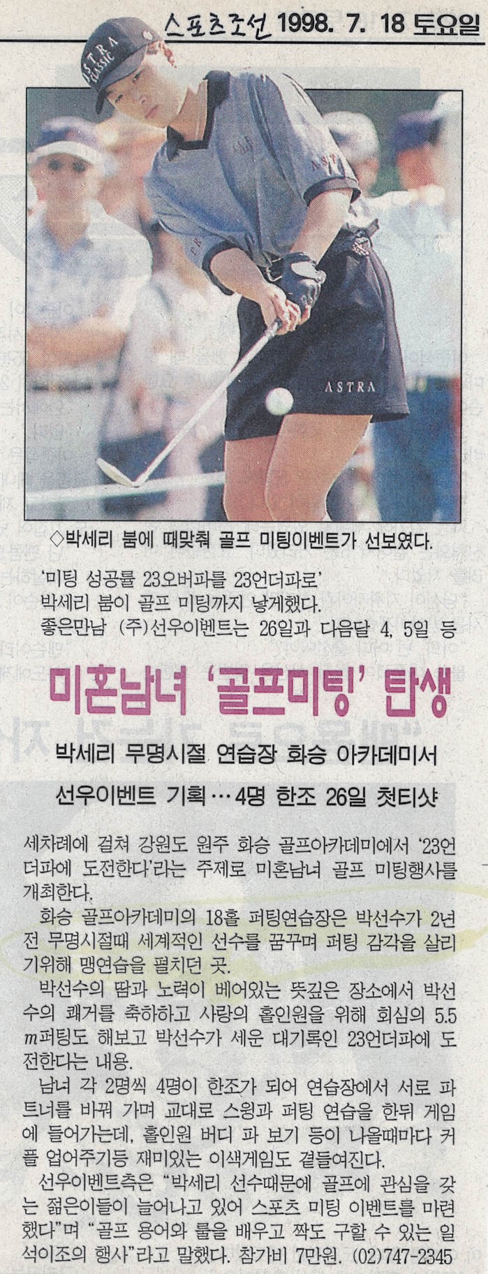 박세리 무명시절 연습장 화승 아카데미서 결혼정보회사 선우 기획... 4명 한조 26일 첫티샷미팅 성공률 23오버파를 23언더파로 박세리 붐이 골프 미팅까지 낳게했다. 결혼정보회사 (주)선우는 26일과 다음달 4, 5일 등 세차례에 걸쳐 강원도 원주 화승 골프아카데미에서 '23 더파에 도전한다'라는 주제로 미혼남녀 골프 미팅행사를 개최한다.