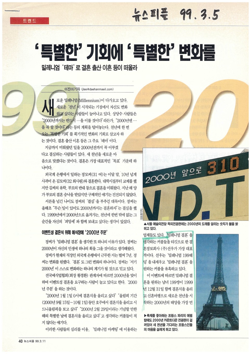 새로운 밀레니엄(Millennium)이 다가오고 있다. 새로운 '천년'이 시작되는 기점에서 자신도 변화 하고싶다는 사람들이 늘어나고 있다. 상당수, 사람들은 "2000년까지는 반드시 ⋯⋯을 이룰 것이다" 라든가, "2000년엔 ・・・ 을 꼭 할 것이다"라는 등의 계획을 털어놓는다. 천년에 한번 오는 '특별한 기회'를 획기적인 변화의 기회로 삼고자 하는 것이다. 결혼 출산 이혼 등은 그 주요 '테마'이다. 지금까지 미뤄왔던 일을 2000년전까지 꼭 이루겠다고 결심하는 사람들이 있다. 새 천년을 새로운 마음으로 맞겠다는 것이다. 결혼은 가장 대표적인 '목표' 가운데 하나이다.