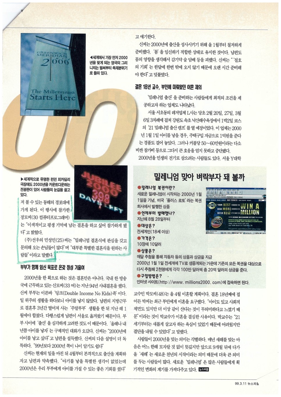 이 이벤트에 따르면 밀레니엄 결혼을 원하는 남녀 199쌍이 1999년 12월 31일 함께 결혼식을 올리고 신혼여행으로 새로운 천년을 시작하는 2000년의 태양을 가장 먼저 볼 수 있는 동해의 경포대에 가게 된다. 이 행사에 참가한 정모씨(30 컴퓨터프로그래머)는 "이색적이고 평생 기억에 남는 결혼을 하고 싶어 참가하게 됐다"고 밝혔다.