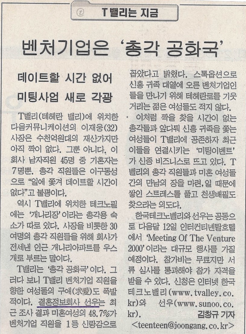 데이트할 시간 없어 미팅사업 새로 각광...T밸리(테헤란밸리)에 위치한 다사의 이재웅(32) 사장은 수천억원대의 재산가지만 아직 짝이 없다. 그뿐 아니다. 이 회사 남자직원 45명 중 기혼자는 7명뿐. 총각 직원들은 이구동성으로 "일에 쫓겨 데이트할 시간이 없다"고 불평이다.