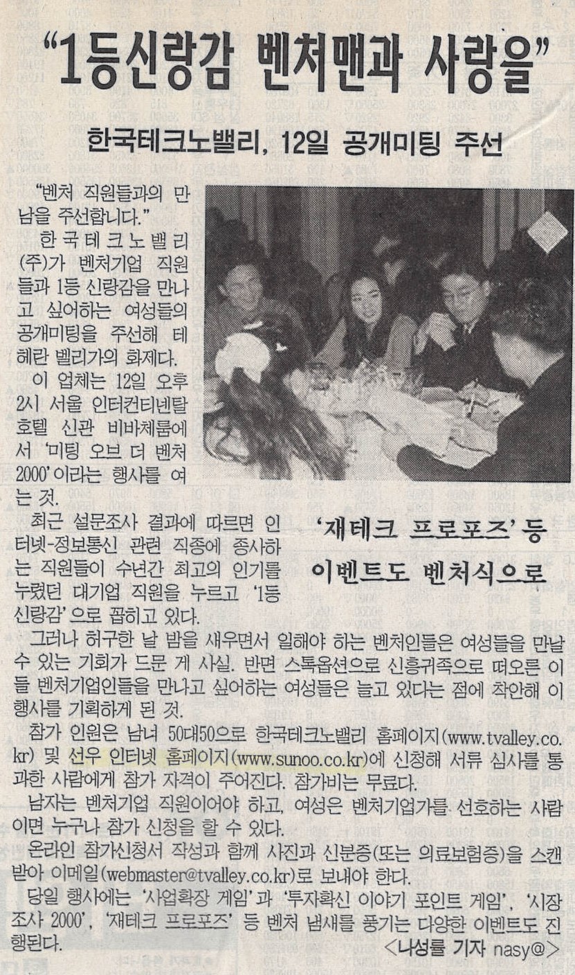 한국테크노밸리, 12일 공개미팅 주선..."벤처 직원들과의 만남을 주선합니다." 한국테크노밸리(주)가 벤처기업 직원들과 1등 신랑감을 만나고 싶어하는 여성들의 공개미팅을 주선해 테헤란벨리가의 화제다. 이 업체는 12일 오후 2시 서울 인터컨티넨탈 호텔 신관 비바체룸에서 '미팅 오브 더 벤처 2000' 이라는 행사를 여는 것.