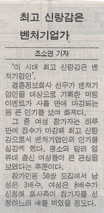 결혼정보회사 선우가 벤처기업인을 대상으로 기획한 미팅 이벤트가 사흘 만에 마감되는 등 큰 인기를 보여 화제다. 그 중 여성 참가자는 하루 만에 접수가 마감돼 최고 신랑감으로서 벤처기업인의 인기를 실감케 했다. 평소와 달리 일류대 출신 여성들이 큰 관심을 보였다는 후문이다. 참가인원 50쌍 모집에서 남성은 3배수, 여성은 8배수가 신청해 회사측이 참가자를 선정하느라 애를 먹었을 정도다.