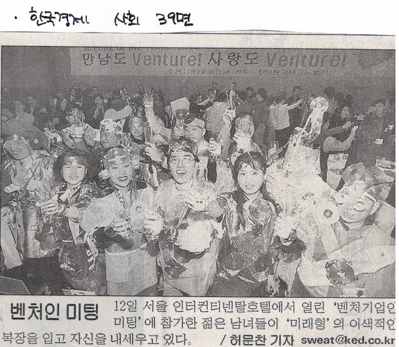 12일 서울 인터컨티넨탈호텔에서 열린 '벤처기업인 미팅'에 참가한 젊은 남녀들이 '미래형'의 이색적인 복장을 입고 자신을 내세우고 있다.