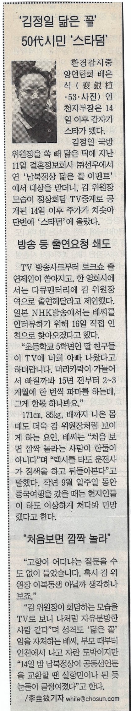 김정일 국방 위원장을 쏙 빼 닮은 덕에 지난 11일 결혼정보회사 선우에서 연 '남북정상 닮은 꼴 이벤트' 에서 대상을 받더니,