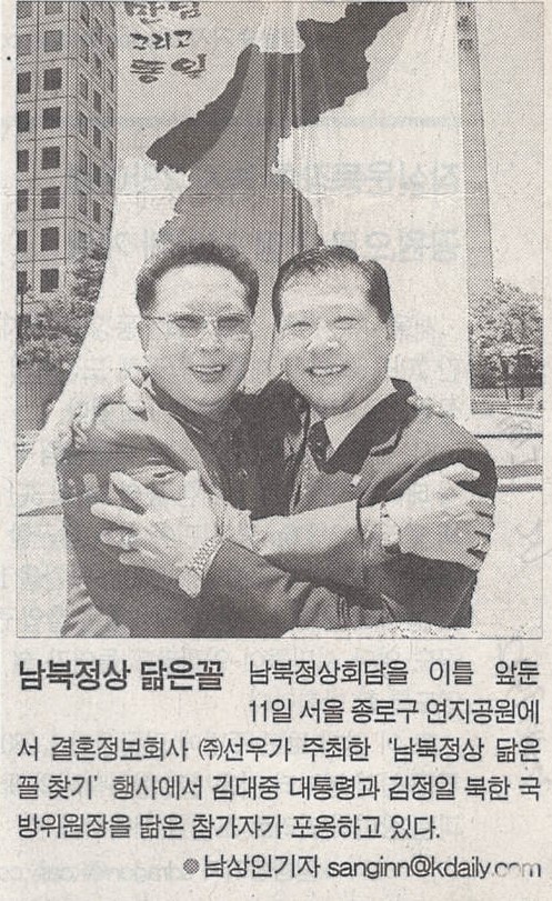 남북정상회담을 이틀 앞둔 11일 서울 종로구 연지공원에서 결혼정보회사 선우가 주최한 '남북정상 닮은 꼴 찾기' 행사에서 김대중 대통령과 김정일 북한 국방위원장을 닮은 참가자가 포옹하고 있다.
