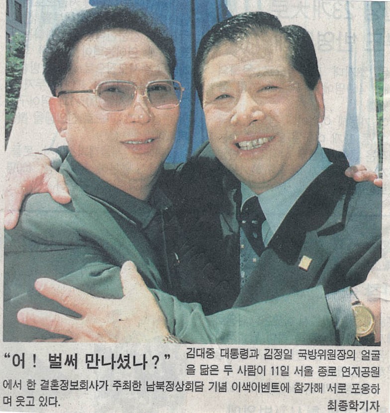김대중 대통령과 김정일 국방위원장의 얼굴을 닮은 두 사람이 11일 서울 종로 연지공원에서 한 결혼정보회사가 주최한 남북정상회담 기념 이색이벤트에 참가해 서로 포옹하며 웃고 있다.