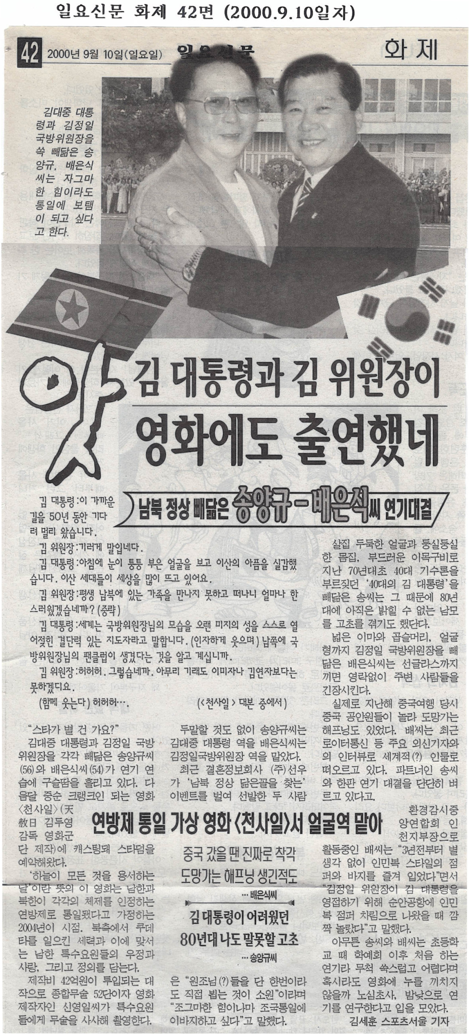"스타가 별건 가요?" 김대중 대통령과 김정일 국방 위원장을 각각 빼닮은 송양규씨 (56)와 배은식씨 (54)가 연기 연습에 구슬땀을 흘리고 있다. 다음달 중순 크랭크인 되는 영화 <천사일>(天赦日 김두영 감독 영화군단 제작)에 캐스팅돼 스타덤을 예약해왔다.